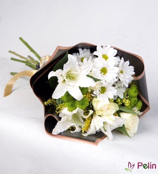 Beyaz lilyum&Beyaz Gül&Papatya buketi