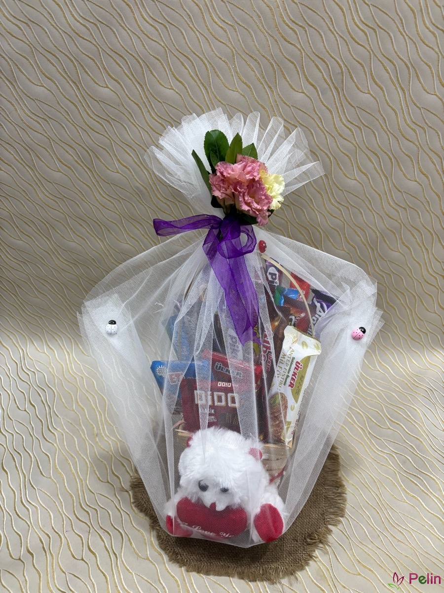 Markalı çikolatalardan oluşan çikolata sepeti ve peluş ayıcık tanzimi süslemesiyle beraber