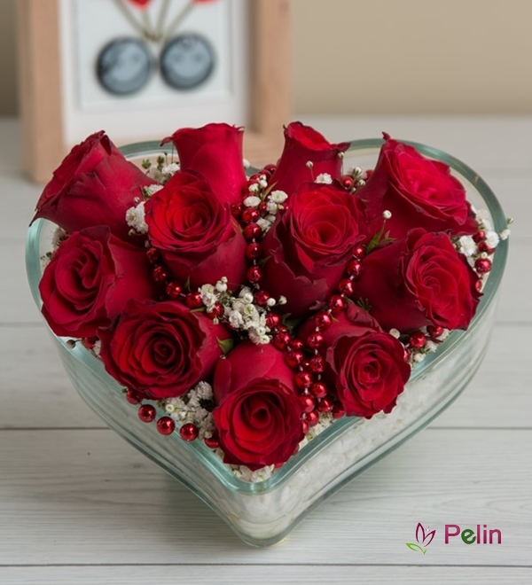 Kalp Vazoda 11 Kırmızı Gül