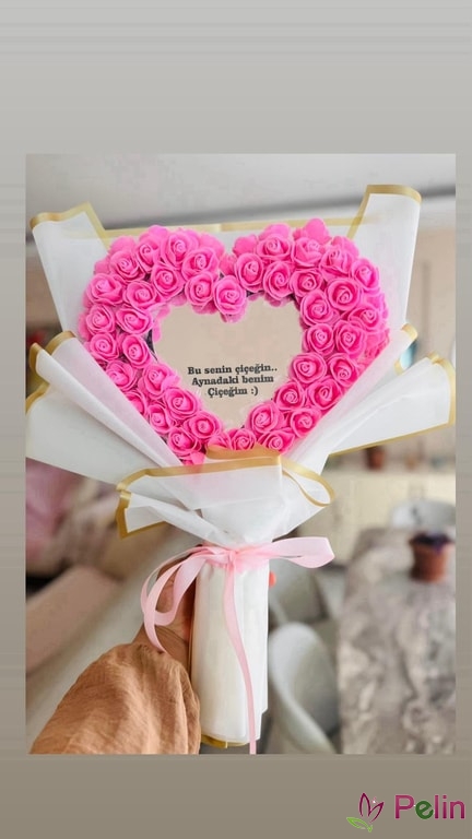Lateks Güllü Aynalı Kalpli Çiçek Buketi Pembe