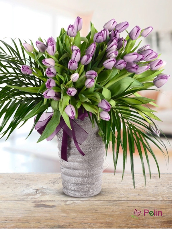 Seramik vazo içi 41 adet mor laleler