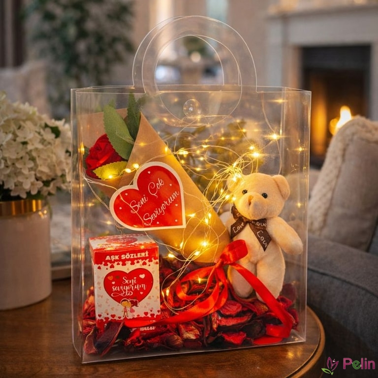 Sevginizi ışıklar eşliğinde anlatmak isteyenler için hazırlanan Işıklı Aşk Çantası, zarif tasarımı ve romantik detaylarıyla büyüleyici bir hediye sunar. Şeffaf çanta içinde yer alan kırmızı gül, sevimli ayıcık, “Seni Seviyorum” temalı ürünler ve led ışıklar ile aşk dolu bir atmosfer oluşturur.